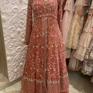 ₹65,000.00Rust Georgette Bridal Anarkali Jacket with Lehenga and Tulle Dupatta